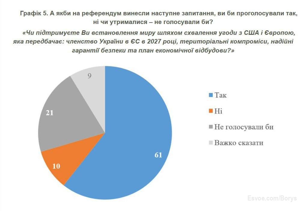 Такий результат можливий, якщо на референдум винести питання про мирну угоду, яка передбачає «територіальні компроміси», членство України в ЄС до 2027 року, гарантії безпеки та план відбудови....