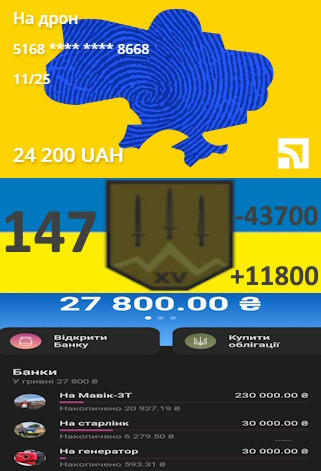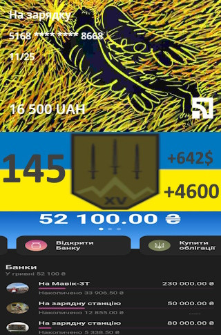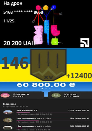 На рахунок МоноБанку надійшло - 7 800 грн., 9 переказів. Велика вдячність: "донатерам" сайту donater.com.ua https://donater.com.ua Максим Агарков https://linktr.ee/vo1dee, Артем Пахомов, Vova Vysotskyi, Halyna Popyk, "донатери", Ольга Бала, "Котики", Зайцева Олена, Давидович Олена. Статиска по зборам за посиланням https://donater.com.ua/u/taras_yarosh. Зараз у "банках" 27 800 грн. Добавилось за тиждень 11 800 грн, витрачено 43 700 грн на купівлю ще однієї бензопили і двох генераторів Покровський напрямок. Зараз наш баланс 52 000 грн.